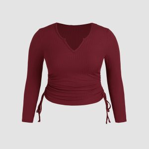 Lady V-neck Drawstring Slim Long Sleeve Crop Top
