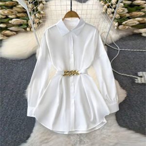 Women’s Elegant Lapel Button-Down Top With Adjustable Metal Waist Belt Solid Color Loose Fit Blouse For Casual & Office Wear