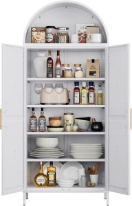 Metal Arched Kitchen Pantry Cabinet,Arched Storage Cabinet,Arch Bookcase With Doors&Adjustable Shelves&Handles For Home Assemble Require, White