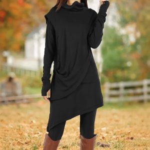 Women’s Elegant Asymmetric Hem Bodycon Mini Dress, Long Sleeve Round Neck Slim Fit Dress For Office And Party
