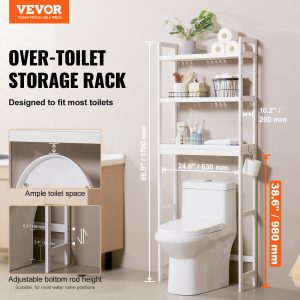 Over The Toilet Storage, 3-Tier Adjustable Over Toilet Bathroom Organizer, Bamboo Storage Shelf Rack With 3 Hooks, Freestanding Easy Assembly Laundry Space Saver, Fit Most Toilets, White