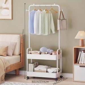 A Multifunctional Metal Storage Rack With A Movable Base, A Freestanding Modern Suit Hanger, A Portable Clothes Rack With Shelves, Suitable For Bedrooms And Home Organization.