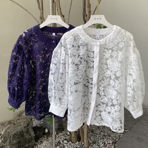 Lantern Sleeve Round Neck Lace Blouse