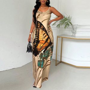 Women’s Color-Block Butterfly Print Maxi Dress, Off-Shoulder Bodycon Gown With High Slit For Spring And Summer Parties