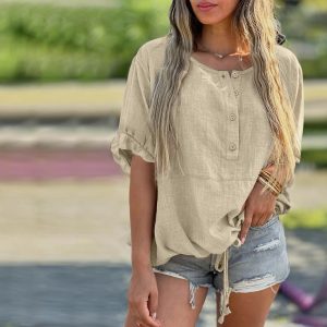 Loose-fit Autumn Cotton-linen Short-sleeve Shirt With A Round Neck And Buttons