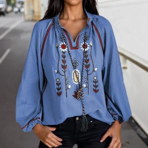 Women’s Round Neck Embroidered Casual Chiffon Shirt