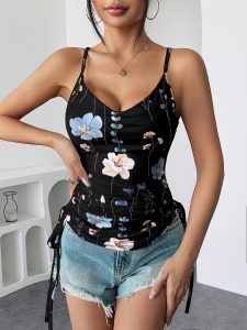 Colored Three-dimensional Floral Spaghetti Strap Pleated Top