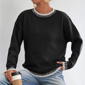 Women’s Round Neck Contrast Color Stitching Leisure Pullover Loose Sweater