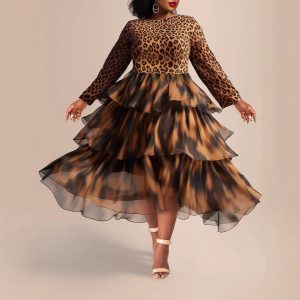Elegant Leopard Print Cake Dress Plus Size Long Sleeve