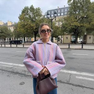 Women’s Long-sleeved Polo Collar Stripes Cotton-padded Coat