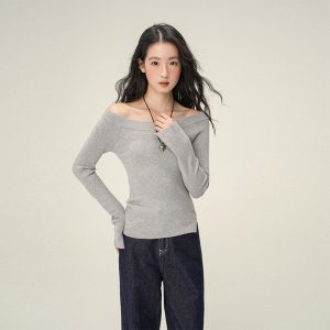 Pure Desire Oblique Angle Shoulder Soft Knit Sweater Base Shirt