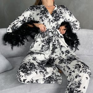 European And American Foreign Trade Flower Print Feather Cuff Home Wear