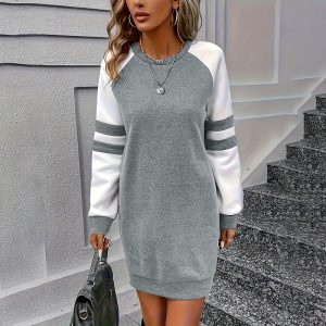 Women’s Color Block Sweatshirt Dress Long Sleeve Crew Neck, Casual Short Pullover Tunic Dress