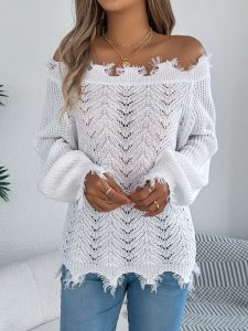 Women Solid Color Hollow Out Long Sleeve Distressed Off-Shoulder Pullover Sweater