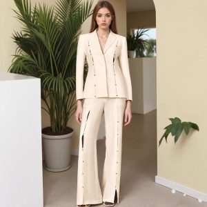 Metal Decorative Strip Embellished Design Trousers Slim Fit Long-sleeve Suit