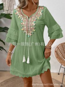 Women’s Seaside Holiday Dress Bohemian Beach Dress Fairy Ethnic Style Embroidered Lantern Sleeve Style Long Swing Skirt