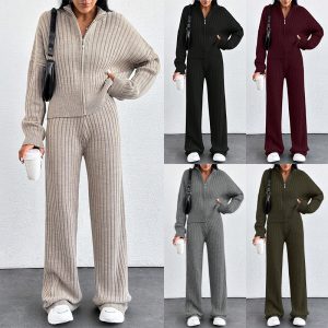 Autumn And Winter New European And American Women’s Casual Loose Zip Top And Trousers Two-piece Set
