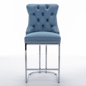 26 Counter Height Bar Stools Set Of 2, Modern Velvet Barstools With Button Back&Rivet Trim Upholstered Kitchen Island Chairs With Sturdy Chromed Metal Base Legs Farmhouse Bar Stools,Light Blue,2 Pack