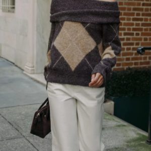 Off-shoulder Rhombus Jacquard Knitted Sweater For Women