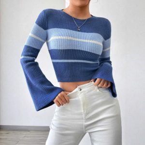 Round Neck Long Sleeve Flared Sleeves Striped Contrast Color Knitted Pullover