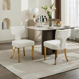Mid Century Modern Dining Chairs Set Of 2, Farmhouse Chenille Fabric Upholstered Accent Chair Curved Backrest With Copper Nails Around,Kitchen Chairs With Golden Stainless Steel Plating Legs, Beige