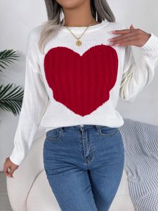 Women Casual V-Neck Lantern Sleeve Color Block Heart Pullover Sweater