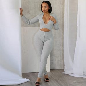 V-neck Hollow-out Long-sleeved Sexy High-elastic Jumpsuit