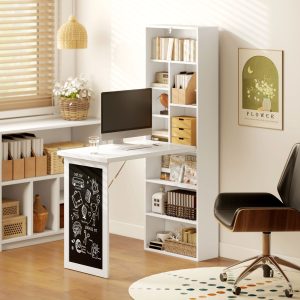 Fold Down Convertible Writing Table, Folding Desk With Blackboard & Side Shelf, Multi-Function Computer Office Workstation, White