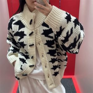 Horn Button Sweater Cardigan Women’s Mid-length Turn-down Collar Coat
