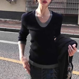 Korean Style Fake Two-piece V-neck Knitted Bottoming Shirt