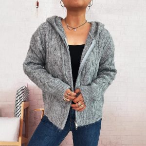 Retro Twist Hooded Lace-up Knitted Coat Casual Zipper