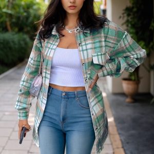 Women’s Lapel Plaid Pocket Long Sleeve Shirt Jacket
