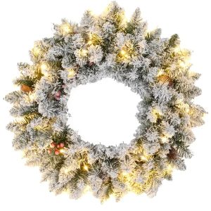 24 Christmas Front Door Wreath With Lights Flocked Christmas Wreath With Pine Cones And Berries For Windows Green