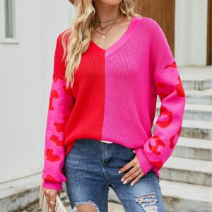 Women’s Casual Contrast Color Leopard Print V-neck Fashion Pullover Sweater