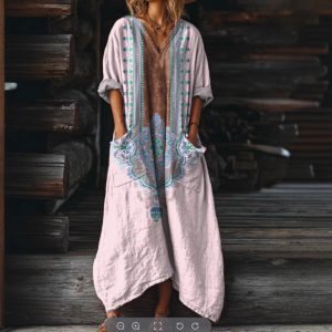 Women’s Floral Print V-Neck Maxi Dress, Flowy A-Line Long Sleeve Gown For Vacation And Daily Wear