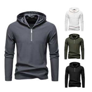 Half Zipper Design Casual Long Sleeve Solid Color Hooded T-shirt