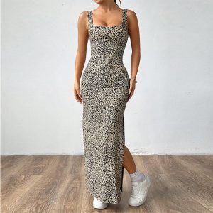 Women’s Casual Versatile Leopard Print Suspender Long Dress
