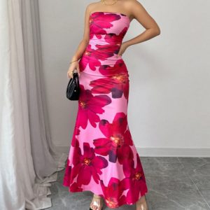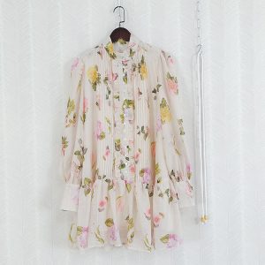 Women’s Vintage Long Sleeve Floral Print Pleated Fungus Lace-up Dress