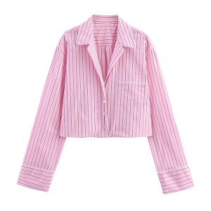 Women’s Fashion Lapel Long-sleeved Pocket Striped Short Shirt