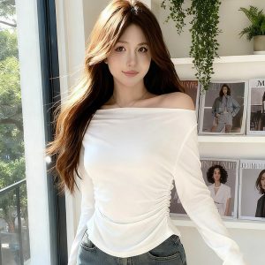 One-shoulder Solid Color Long-sleeve Women’s Off-shoulder Slim-fit Base Top