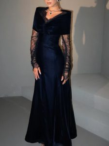 Navy Blue Velvet Lace Long-Sleeve Gown