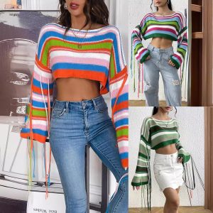 Women’s Off-shoulder Midriff-baring Sweater Knitted Bell Sleeve Top