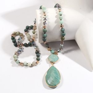 Natural Stone Glass Knotted Green Natural Stone Heart Pendant Necklace Sweater Chain