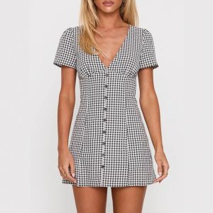 Sexy V-neck Black And White Plaid Waist Tight Dress