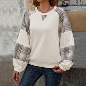Women’s Love Plaid Lantern Long Sleeve Pullover Sweater