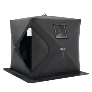 Portable Ice Shelter, 3-4 Person Pop-Up Ice Fishing Tent, 43 Square Feet Fishable Area, Ice Shanty For Winter Fishing, Waterproof Oxford Ice Cube With Anchors/Ropes/Carrying Bag, 90″x90″, Black