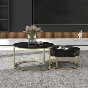 Round Coffee Tables With Drawer, Removable Set Of 2 End Table, Nesting Tables With Storage Gold Metal Frame Legs And Marble Pattern -non-rock Slab-Top For Living Room, Bedroom, Office, Balcony
