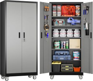 Garage Storage Cabinet With Pegboard And 5 Adjustable Shelves, Metal Lockable Cabinet With Magnetic Doors,Tool Storage,Home Office Garage,Gym,School Black-Grey
