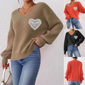 Women’s V-neck Lace Brick Bow Patchwork Pocket Pullover Top
