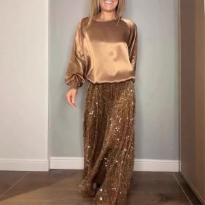 See-through Sequined Feather Dress Oblique Shoulder Split Sexy Hip Skirt Women’s Clothing